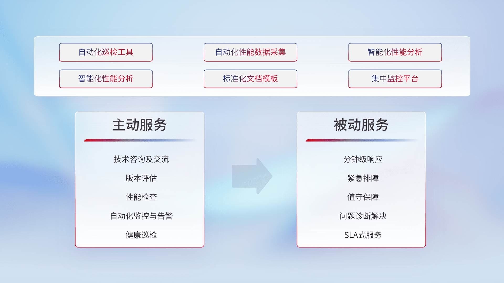 智能化工具和标准化文档,,,,保障服务质量,,,提供主动服务(包含技术咨询、、版本评估、、、、性能检查、、自动化监控与告警、、健康巡检)和被动服务包含(分钟级响应、、、紧急排障、、、值守保障、、、、问题诊断解决、、SLA服务)。。。。