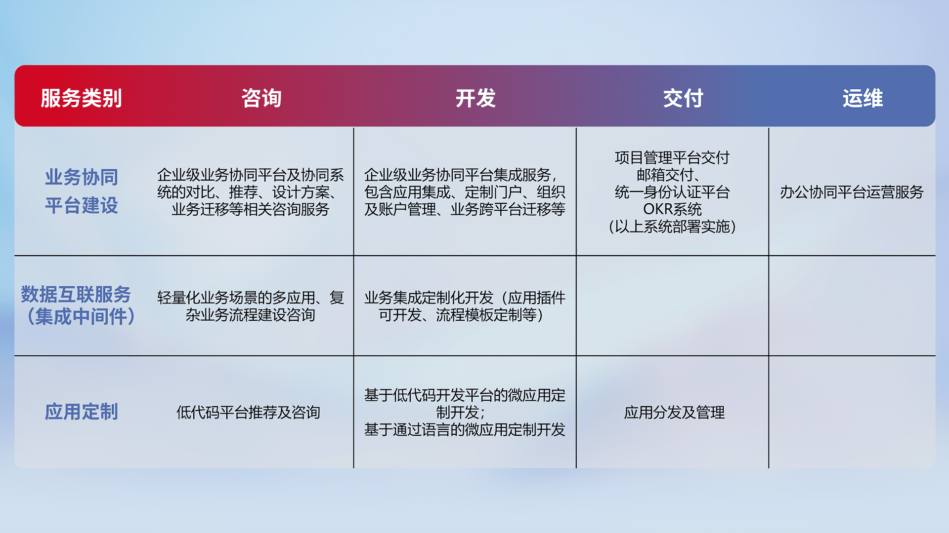 针对钉钉、、、企微、、、、IDaas等平台级产品提供产品的规划、、、、方案、、、、交付、、定制化开发等服务,,,实现如统一协同办公、、、、智能客户服务、、、混合会议管理、、、、智能数据查询、、、等业务场景,,,实现数字化转型。。